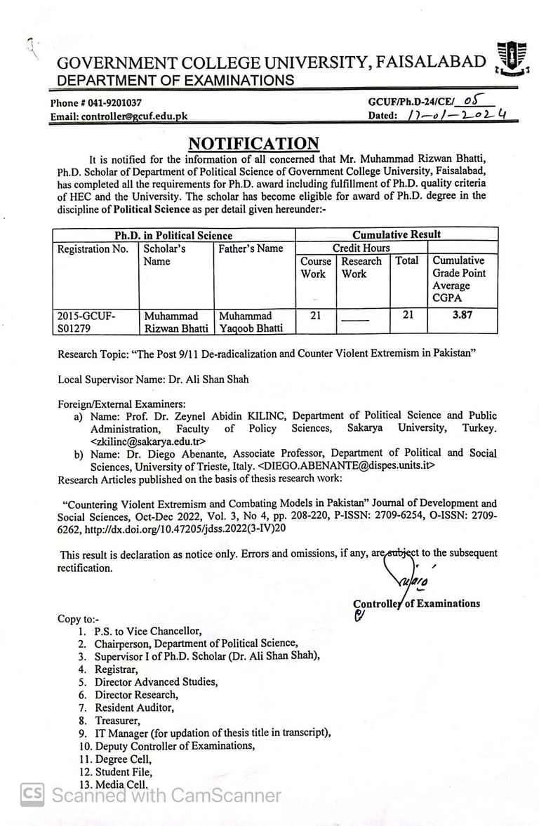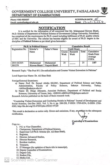 Dr. Rizwani holds a Ph.D. in Political Science from Government College University, Faisalabad (GCUF). His dissertation, titled “The Post 9/11 De-radicalisation and Counter Violent Extremism in Pakistan”, explores the complex dynamics of extremism and the critical efforts to curb violence and radical ideologies in Pakistan, especially in the aftermath of global events post-9/11.